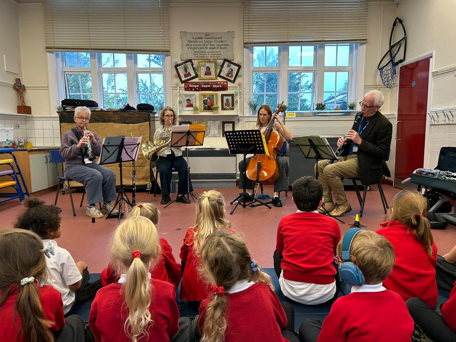 We have strong links with Britten Pears and regularly take part in workshops such as drumming, orchestra or singing run by professional muscians based at the Maltings. We also have visiting musicans to school such as chamber orchestras or Folk groups so our children experience live music on a regular basis. We also have strong links with Folk East and work with folk musicians such as Finn Collinson and the Young 'uns.